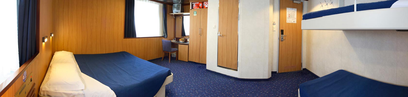 Interior cabin for 4 without porthole Upper deck cabin with 4 beds and en suite bathroom with shower, without porthole. (C4)